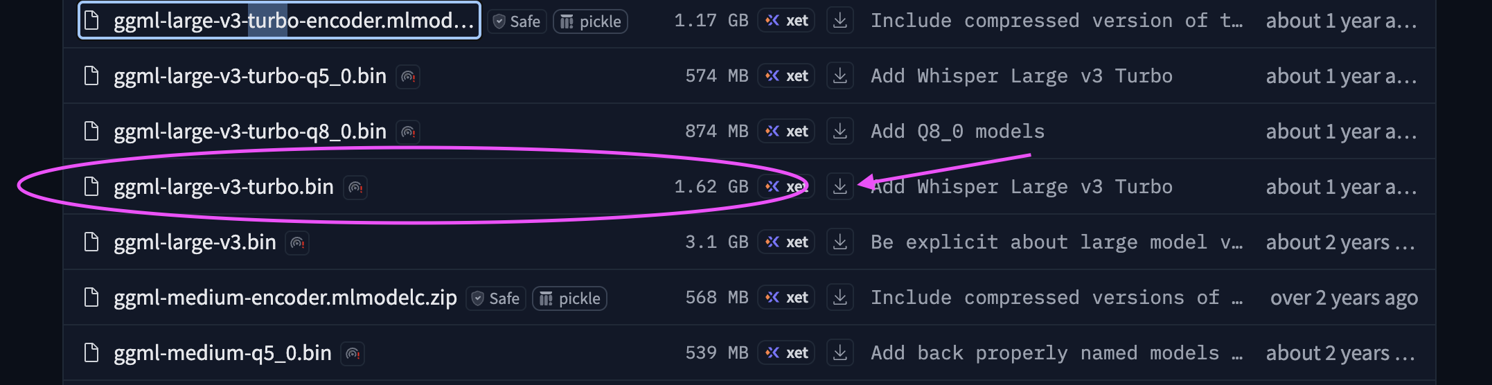 Lastly, whisper.cpp needs a "model" to run; this is a big ol' file that is basically the brain of Whisper. There are a LOT of models out there, but before you get overwhelmed, let me just tell you that my favorite is large-v3-turbo, which is a newer one that is both fast and accurate. You can download it here; you'll have to scroll down a bit to find it.