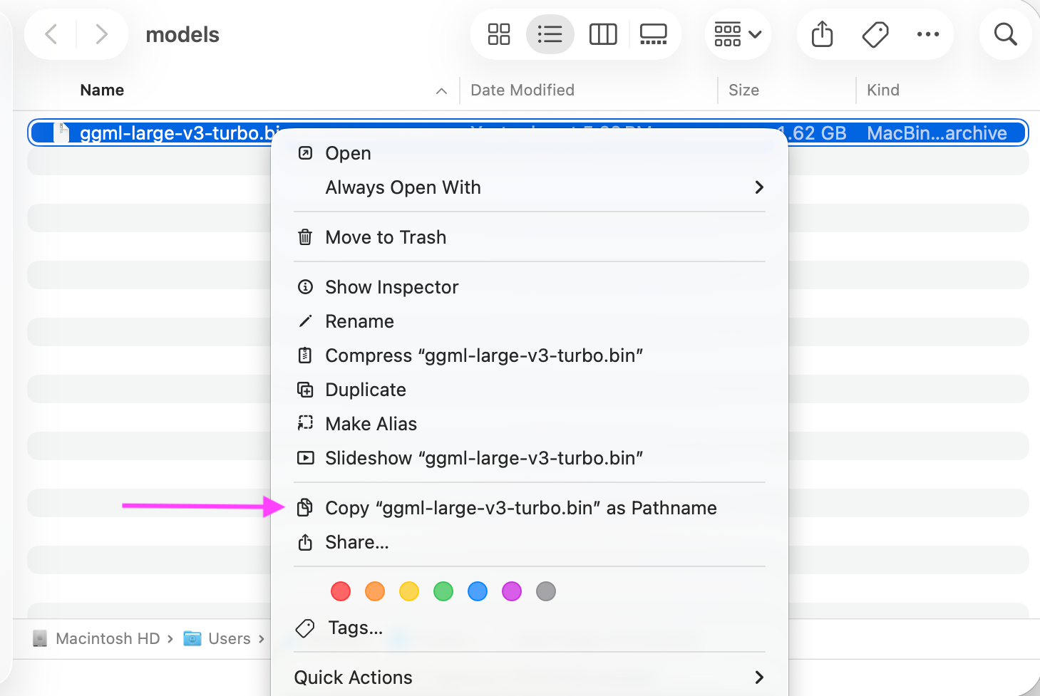 Now, see that line about the MODEL? Find the path to the model that you downloaded on your machine, and type or paste it in there. If you locate the model in your Finder, you can hold down the control key, click the file, then hold the option key. That will show you an option called "Copy…as Pathname." Do that, and paste it inside the quotation marks there.