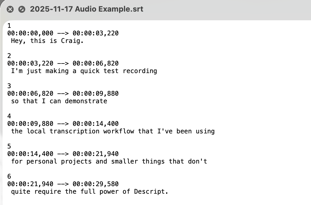 The second one is an SRT file. These are files that were originally made to create subtitles for video, but they present the text as well as timestamps in a very readable format.