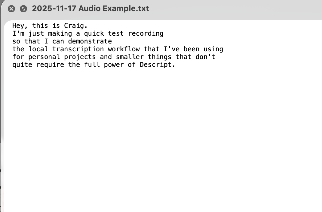 Now, almost 9 years later, transcription (via AI) is built in to many audio and video editing programs, including Pro Tools and Descript. But those are big, expensive tools for complex projects, and there are some pieces of audio that I'm not necessarily planning on editing or incorporating into a larger narrative. For example, I've been trying to keep an audio journal lately, and it's nice to have a transcript that serves as a searchable record of what I've been blabbering about. (More on the specifics of that audio journal in another newsletter!)